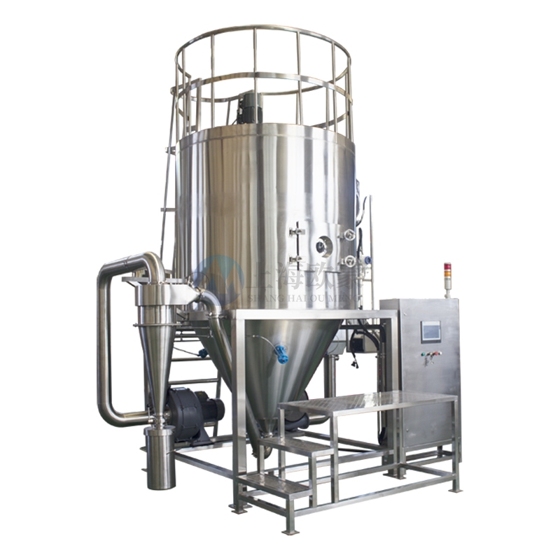 高速離心噴霧干燥機(jī) | 高效噴霧干燥設(shè)備 | 工業(yè)級(jí)快速干燥解決方案:干燥機(jī)為開式循環(huán),并流式,離心式霧化。干燥介質(zhì)空氣經(jīng)過初、中效空氣過濾器過濾后根據(jù)操作指令由鼓風(fēng)機(jī)吸取再經(jīng)加熱器加熱通過高效過濾器的熱風(fēng)分配器進(jìn)入噴霧干燥主塔。液體物料根據(jù)操作指令經(jīng)過蠕動(dòng)泵,進(jìn)入高速旋轉(zhuǎn)的離心噴頭,在離心力作用下被分散成小霧滴。在噴霧干燥主塔內(nèi),小霧滴與熱風(fēng)在充分接觸,沿其特定路徑進(jìn)行熱交換后被干燥成為產(chǎn)品,然后通過旋風(fēng)分離器實(shí)現(xiàn)分離,固體物料被收集,氣體介質(zhì)再經(jīng)過過濾后被排出。整套噴霧系統(tǒng)易清潔、無死角,符合GMP要求。